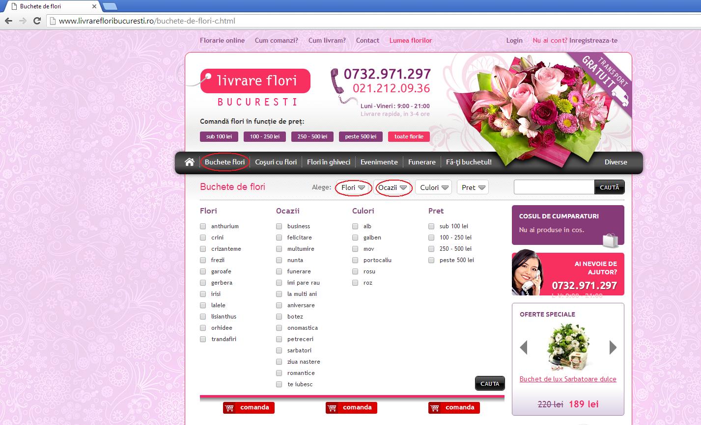 M-au frapat aranjamentele florale pe care le-am găsit pe site şi cel mai mult mi-a plăcut că poţi selecta ocazia în care vrei să oferi flori cadou. De asemenea îţi poţi realiza singură buchetul, şi cel mai important, florile sunt livrate în maxim 4 ore de la plasarea comenzii.